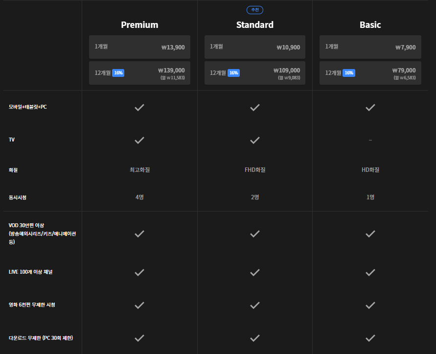 웨이브 요금제는 총 3가지로 구성되어있습니다.