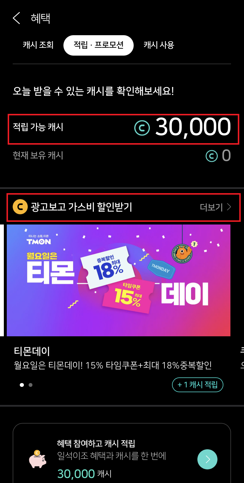 오늘 받을 수 있는 캐시가 총 30,000(3만)캐시입니다.