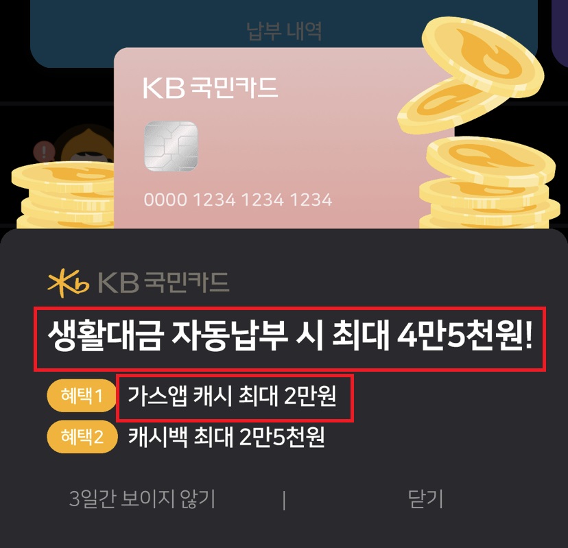 현재 국민카드에서 생활대금 자동납부 시 최대 4만5천원 할인이 된다고 하네요.