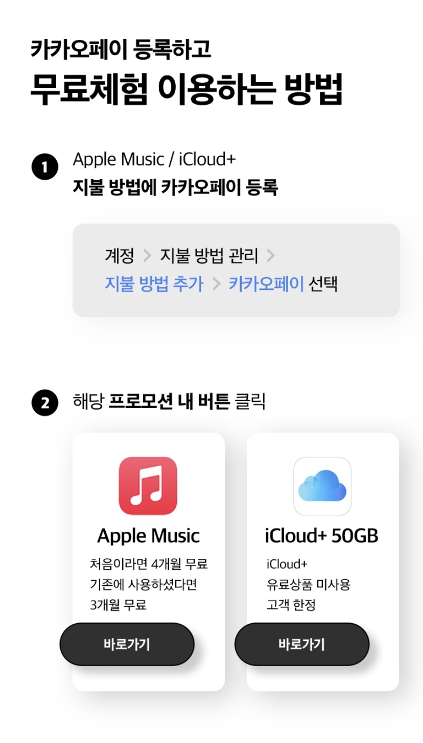 참고로 3번 앱스토어에 카카오페이 등록하는 방법은 애플뮤직, 애플티비, 애플 아케이드, 아이클라우드까지 무료로 몇 개월을 사용할 수 있습니다. 개이득!
