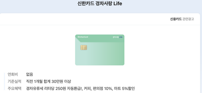 - 실적 필요 없이 1L 당 250원이 할인이 되는 신한카드 경차사랑입니다.