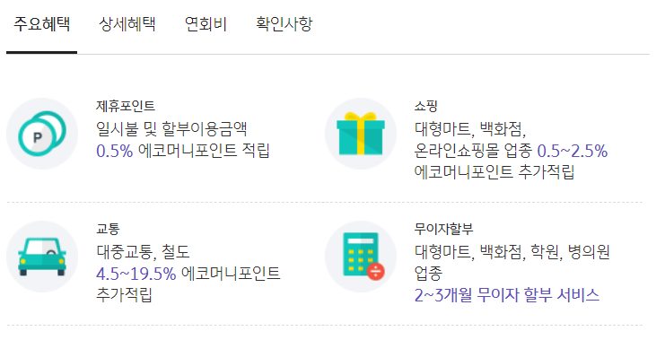 신용카드를 자주 사용하지 않아, 연회비가 아까워 상담원과 이야기하던 중 추천받아 발급받은 신용카드입니다.