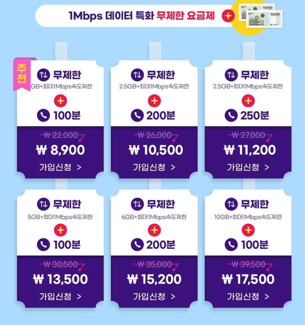 추천 요금제인 1GB + 1Mbps 무제한과 통화 100분이 1만원도 안하는 8,900원이라니, 말도 안되게 저렴한 가격입니다.