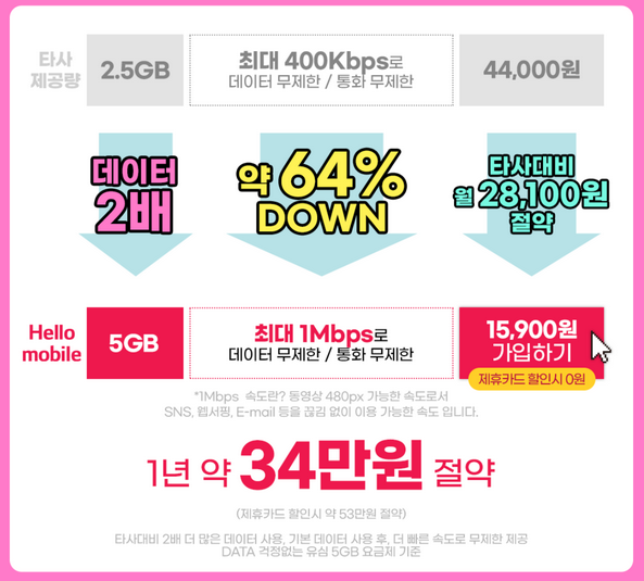 타사대비 데이터는 2배, 가격은 월 28,100원 절약 1년에 약 34만원의 절약이 가능한