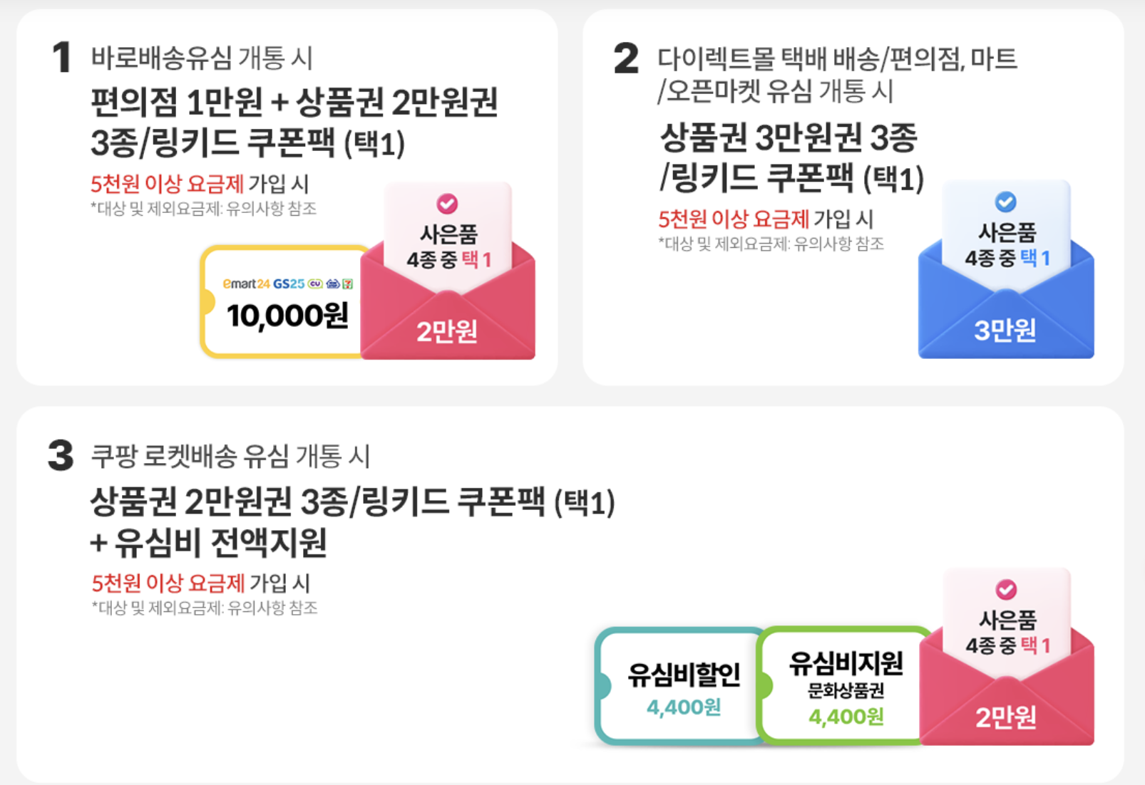 1. 바로배송유심 개통 시 편의점 1만원 권 + 상품권 2만원권