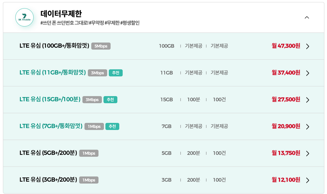: 7GB 기본 제공 후 소진 시, 최대 1 Mbps 속도로 무제한 이용 가능합니다.