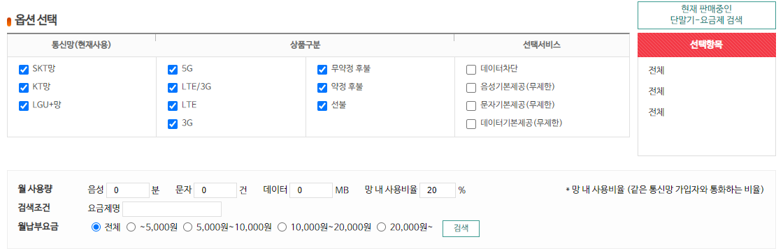 휴대폰 종류, 통신망이나, 사용량에 따라 원하는 요금제를 상세하게 선택할 수 있더군요.