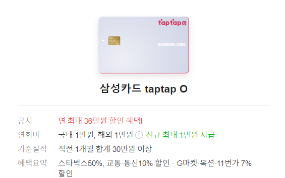 > 인기 많은 카드중에 하나인 삼성카드 탭탭 오, 혜택들을 보면 사회 초년생이 사용하기 좋은 카드 인 듯 합니다.