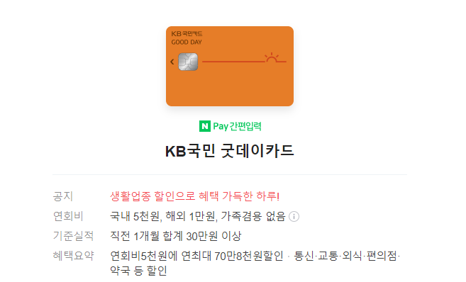 >인기많은 신용카드 중 하나인 국민카드 굿데이카드입니다. 다양한 분야에서 혜택을 받을 수 있고 연회비도 5,000원으로 저렴하네요.