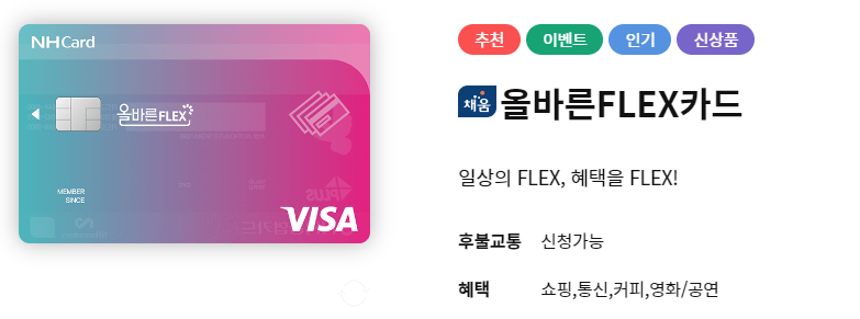 >인기 많은 신용카드 중 하나인 농협 플렉스 카드입니다. ott서비스는 웬만하면 구독하고 있기때문에 이왕 하는 결제 할인받으며 좋겠네요. 다양하게 혜택을 받을 수 있는 농협 신용카드 입니다.